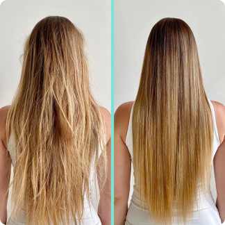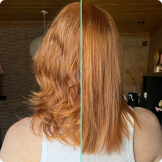 "Siempre iba a la peluquería buscando soluciones para mi pelo seco y sin vida. Ahora, mi pelo brilla y se nota mucho más sano, y lo mejor de todo, ¡desde casita!"